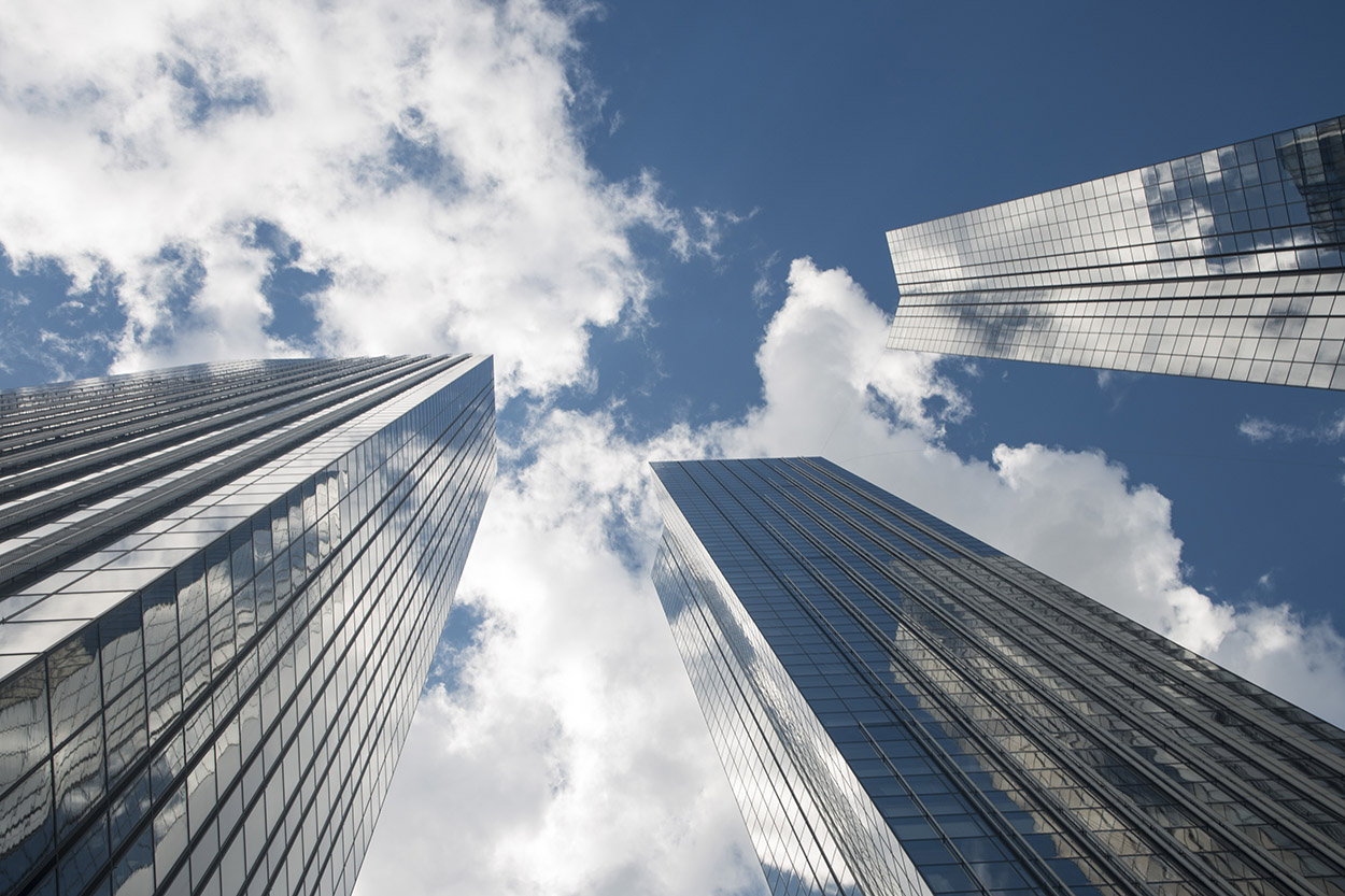 Три стеклянные башни устремляются вверх, образуя строгую, почти симметричную композицию. Их фасады отражают небо и облака, растворяя границу между построенным и естественным. Кажется, что здания не давят, а наоборот — открывают небо, направляя взгляд вглубь кадра.