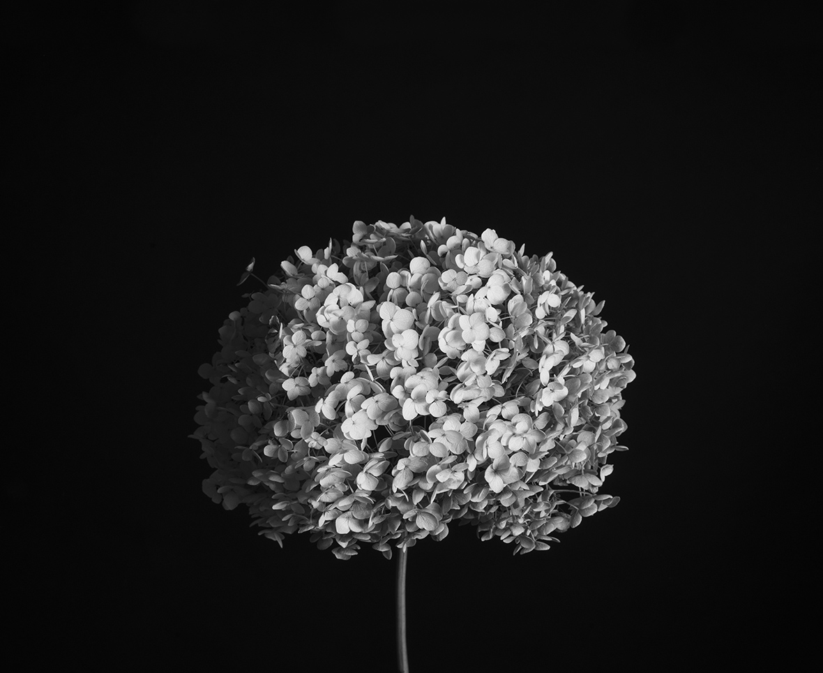Фотография «Белая гортензия» — это исследование формы, света и тишины. Пышное соцветие, снятое на тёмном фоне, подчёркивает хрупкую структуру лепестков и их естественный ритм.