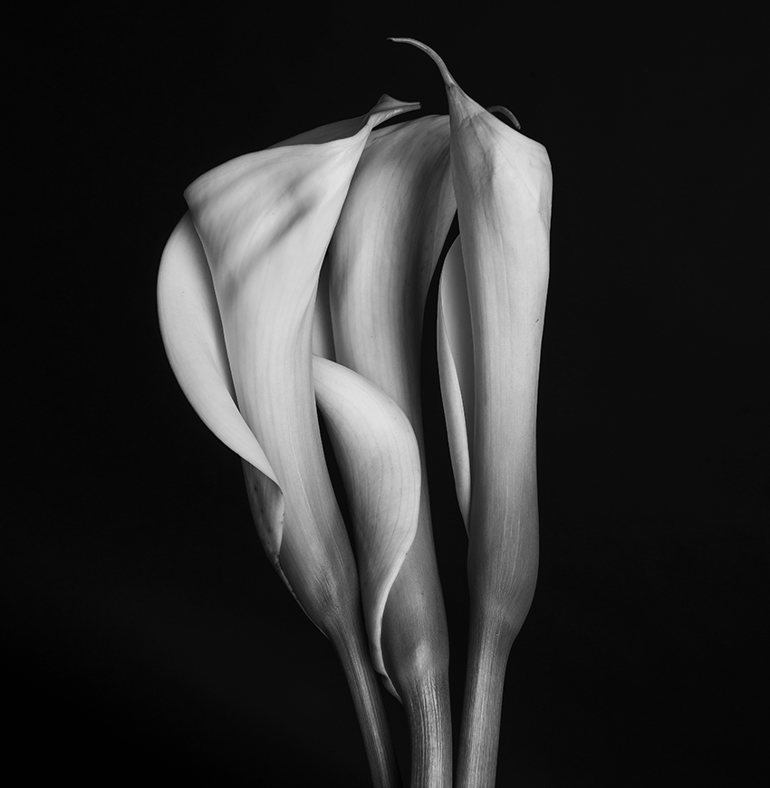 Черно-белая фотография цветка каллы, снятая в минималистичной манере, где свет и тень превращают природную форму в почти скульптурный объект. Плавные линии лепестков и глубокий чёрный фон создают ощущение тишины, хрупкости и сосредоточенности.