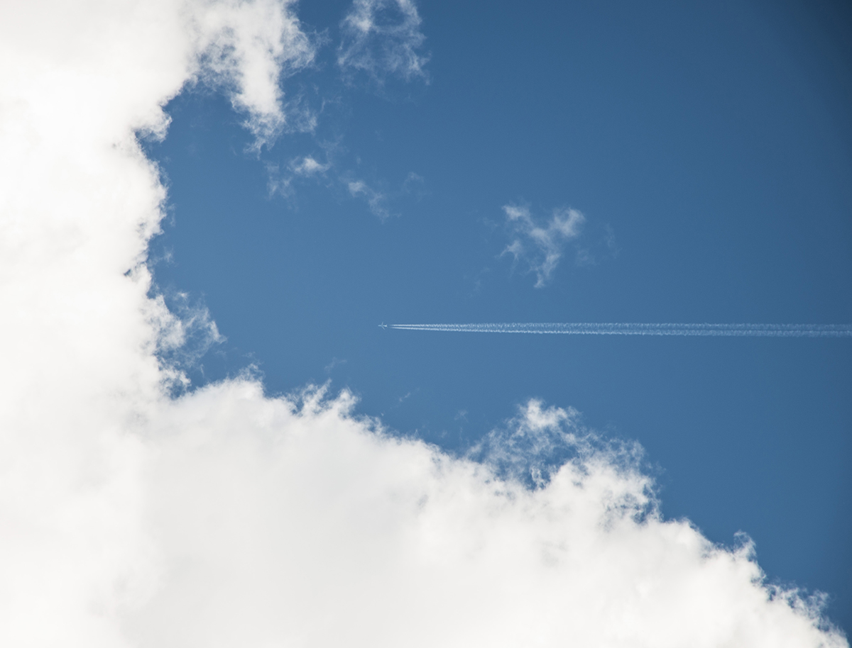 Фотография «Самолёт в облаках» построена на ощущении простора и движения. Небо занимает почти всё пространство кадра, а тонкая линия инверсионного следа подчёркивает масштаб и глубину сцены.