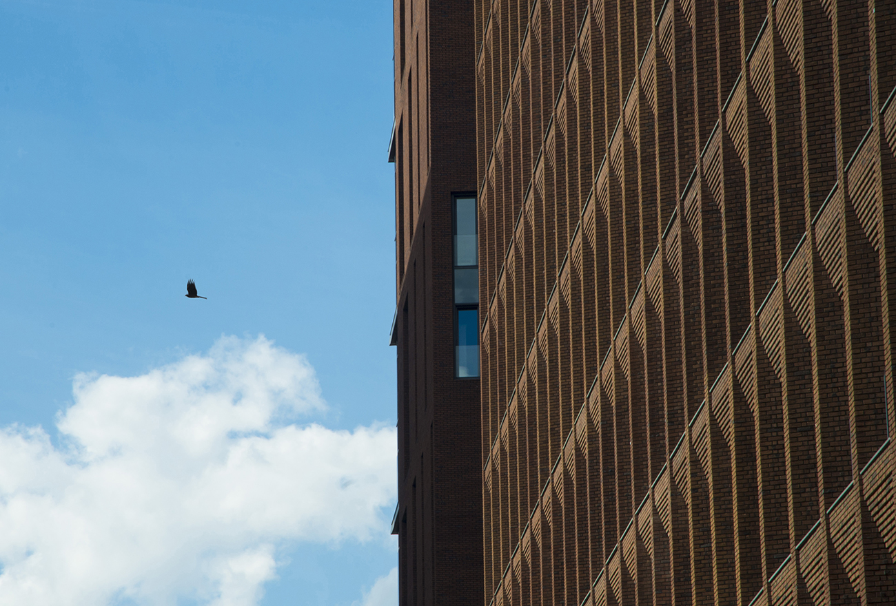 Сокол пересекает кадр легко и уверенно, словно не замечая строгого фасада здания, выстроенного из повторяющихся ритмов и линий. Вертикаль кирпичной стены подчёркивает масштаб архитектуры и холодную логику города, тогда как небо остаётся пространством дыхания и движения. Птица соединяет эти два мира — она здесь лишь на мгновение, но именно её присутствие придаёт сцене смысл и напряжение.